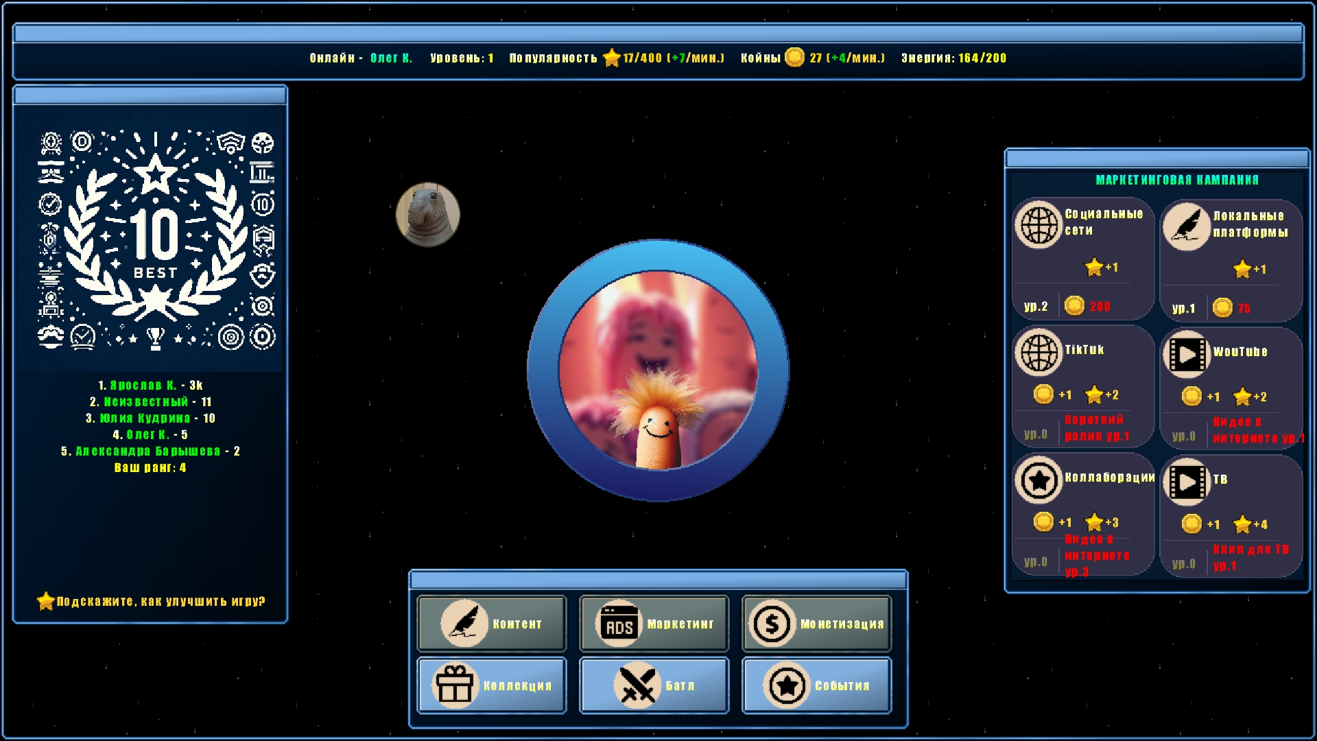 Были большие сомнения, информировать ли кого-то об этом трешовом проекте, т.к. кликер с обилием рекламы - это вообще не то, чем хочется хвалиться. Но тем не менее, это успешно освоенный опыт. В игре реализовано сохранение прогресса онлайн и рейтинг игроков.